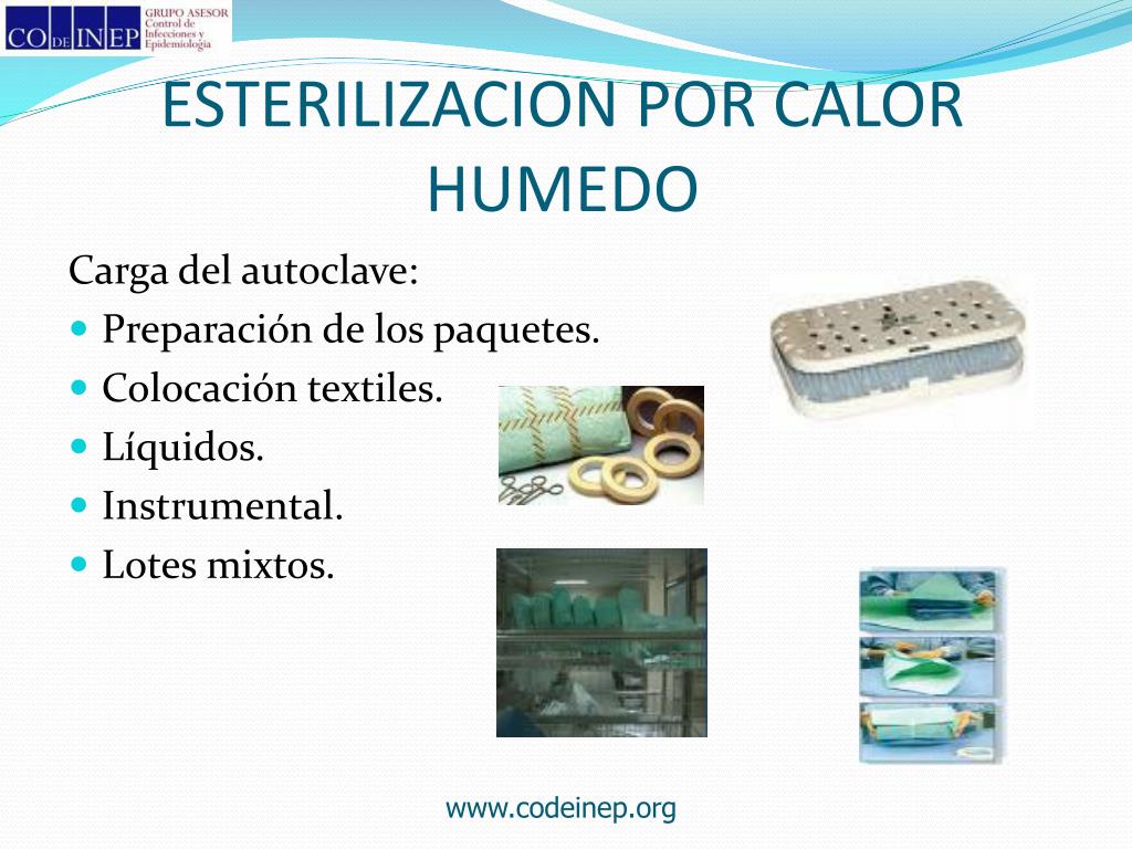 La esterilización por calor húmedo utiliza vapor, agua caliente o agua hirviendo para eliminar los microorganismos, siendo el método más eficaz el autoclave. Este proceso destruye los microorganismos por coagulación de sus proteínas celulares.