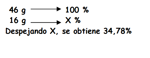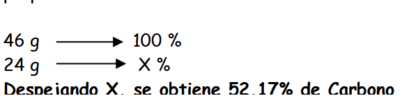 Si 46 gramos equivalen al 100 %, y hay 24 gramos de Carbono, entones se plantea la siguiente proporción: