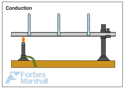 El calor puede ser transferido a través de sólidos, líquidos y gas. La conducción se verifica mediante la transferencia de energía cinética entre moléculas adyacentes (contacto directo). En los gases y líquidos la conducción se debe a las colisiones y a la difusión de las moléculas durante su movimiento aleatorio. En los sólidos se debe a la combinación de las vibraciones de las moléculas en una retícula y al transporte de energía por parte de los electrones libres.