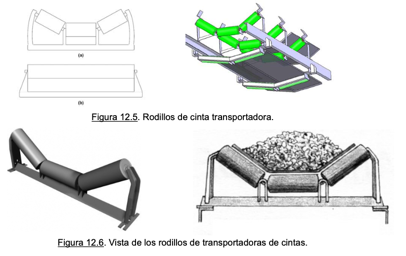 Rodillos: Cuando se realiza transporte de material sólido a granel se requiere configurar el sistema con rodillos que conformen una canaleta de transporte. Cuando la cinta avanza hacia el punto de descarga del material se utiliza la disposición a), cuando regresa la cinta vacía se utiliza 1 sólo rodillo (configuración b).